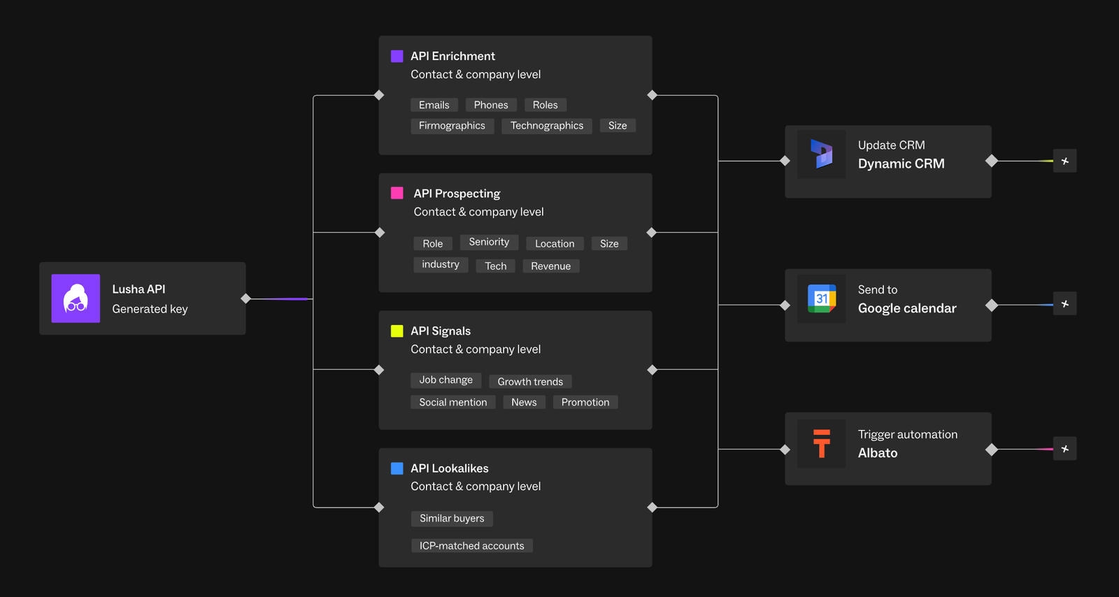 Lusha, API’ler ve webhook’lar aracılığıyla sistemlere veri akışı sağlayabilir. Resmi ürün açıklamasında, araçlara bağlanarak contact enrichment, account updates ve workflow senkronizasyonu yapılabildiği belirtilmektedir.