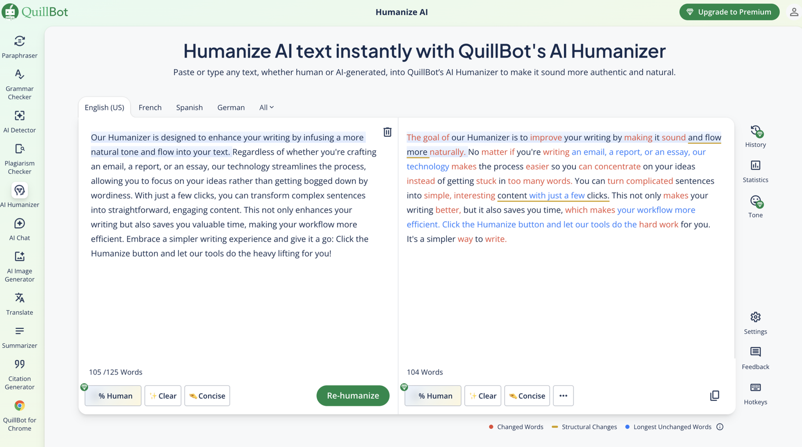 QuillBot Humanizer, yapay zeka tarafından üretilen içerikleri daha doğal ve insan tarafından yazılmış gibi görünür hale getirmek için tasarlanmış gelişmiş bir metin dönüştürme aracıdır.